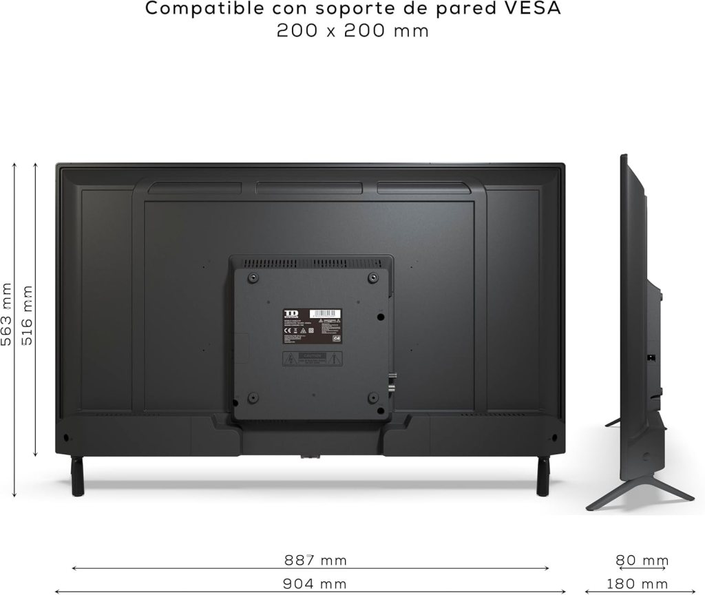 El diseño del televisor es simple pero funcional, con un acabado negro tanto en el frente como en la parte trasera. Las patas, también de color negro, son desmontables, lo que permite montarlo en la pared usando el estándar VESA 200 x 200 mm. Con un peso de solo 6 kg, es relativamente fácil de manejar e instalar. Cabe destacar que este modelo está disponible también en 32 pulgadas y en unas muy ajustadas 24 pulgadas.