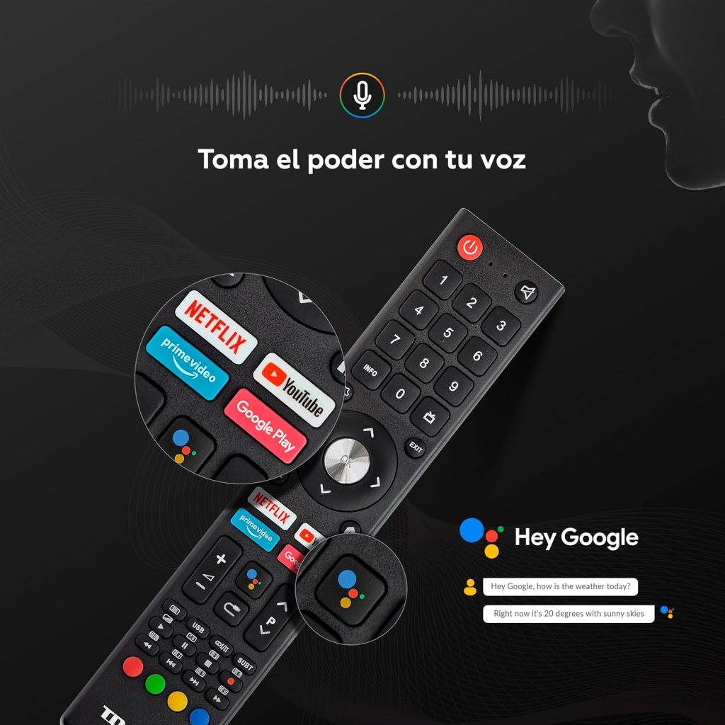 El televisor viene con un mando a distancia que incluye control por voz, lo que permite interactuar fácilmente con el televisor utilizando Google Assistant. Este mando es ergonómico y su configuración es sencilla, facilitando el acceso a las funciones más utilizadas del televisor con un solo clic.