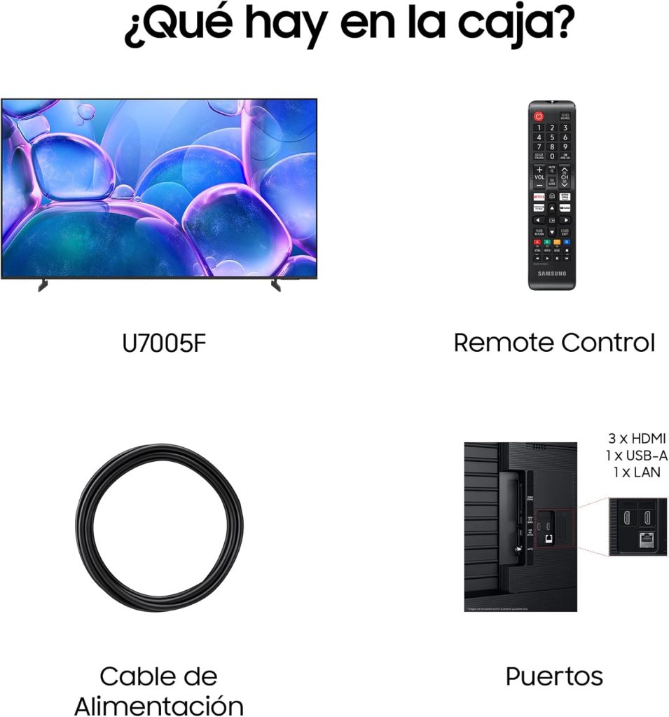 El diseño del U7005 mantiene la elegancia típica de Samsung. Es minimalista, con bordes finos y un acabado moderno que se adapta bien a cualquier sala. Muchos usuarios lo elogian por su estética limpia, ideal para montarlo en pared o colocarlo sobre un mueble.