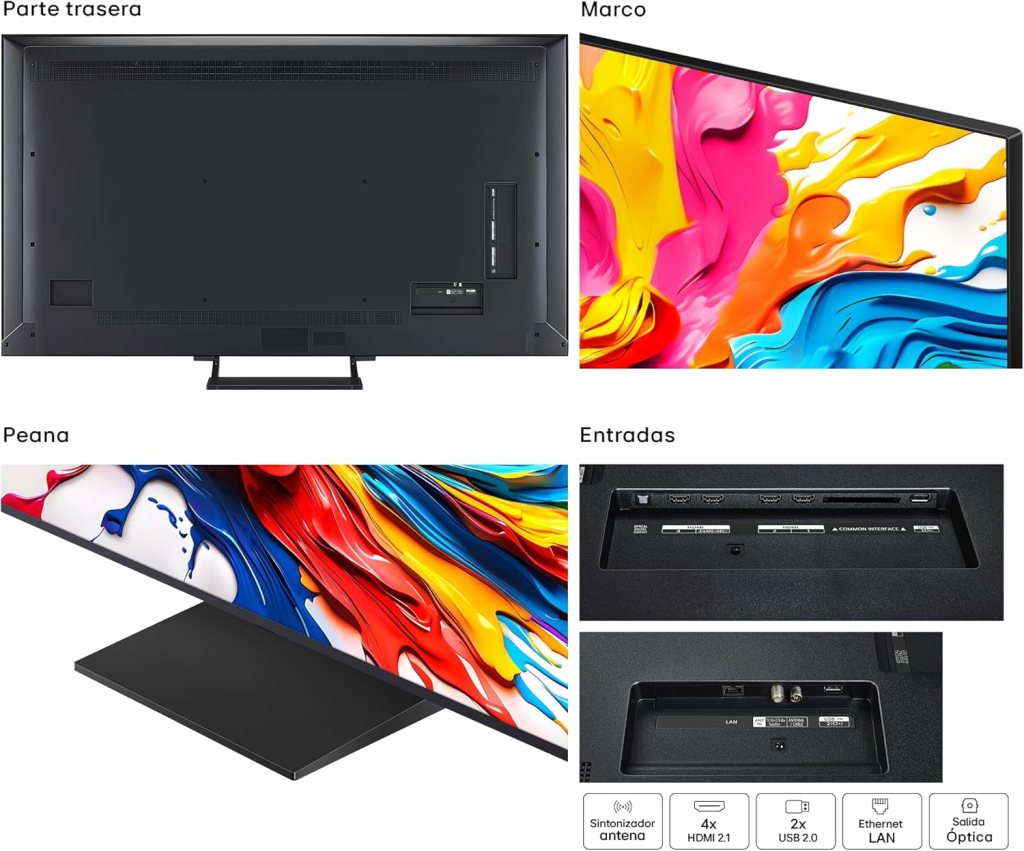 A nivel inalámbrico, equipa WiFi 6 y Bluetooth 5.3, garantizando conexiones más rápidas y estables con dispositivos externos, mandos o auriculares. Esta mejora en la conectividad le da una clara ventaja frente a otros televisores 4K de gama media-alta.