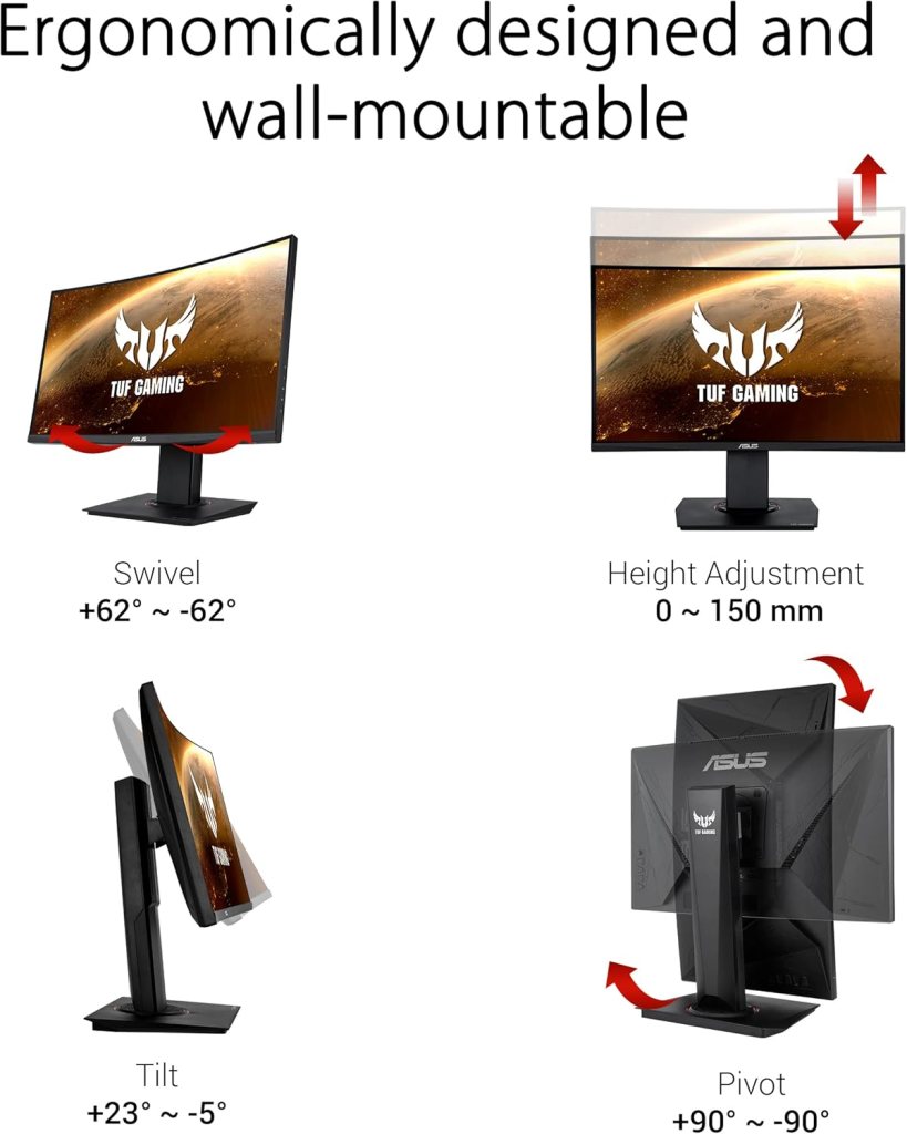El diseño del monitor ASUS TUF Gaming VG24VQ mantiene una estética gaming sobria y funcional. Su base permite ajustes de altura, inclinación, giro y pivote, algo clave si pasas muchas horas frente a la pantalla y buscas una postura cómoda. La curvatura y el tamaño lo hacen adecuado tanto para escritorios medianos como para setups centrados en una sola pantalla.