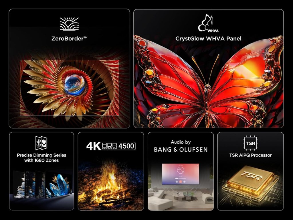 El diseño de la TCL C8K es elegante y moderno. El marco ZeroBorder™ hace que la pantalla parezca flotar, especialmente en tamaños grandes. Su diseño delgado e integrado encaja bien tanto en salón como en instalaciones más premium.