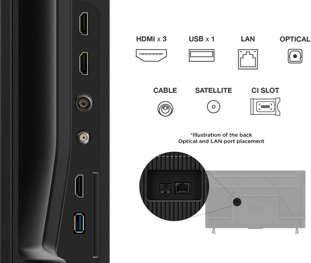 En conexiones, se menciona HDMI 2.1 orientado a gaming, y funciones típicas como HDMI-CEC y soporte de retorno de audio (ARC/eARC según configuración de la gama/tienda). Para la mayoría, esto cubre consola, barra de sonido y un extra para decodificador o PC.