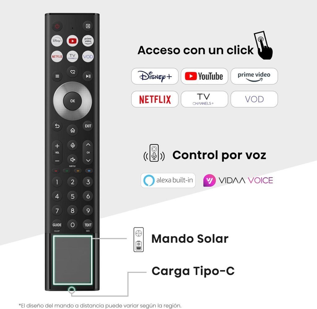 Además, destaca por incluir un panel de carga solar en la parte trasera, junto con puerto de carga USB-C, lo que permite olvidarse de las pilas tradicionales. En las opiniones sobre la Hisense U8Q, este mando suele valorarse de forma positiva por su comodidad, por el control por voz y por el sistema de carga, que resulta más práctico que el de los mandos convencionales.