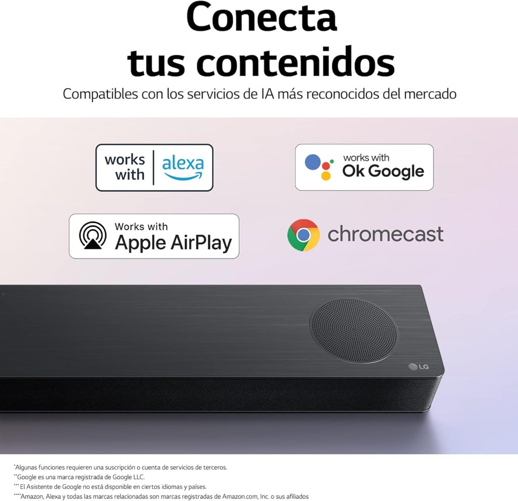 Funciona con cualquier televisor, pero con una TV LG se aprovecha mejor la integración, especialmente por HDMI eARC. Todo fluye de forma más natural y se controla de manera más cómoda con un solo mando. En este apartado, alternativas como Sonos destacan por su ecosistema, pero esta LG ofrece una experiencia muy completa sin necesidad de entrar en ese nivel de precio o configuración.